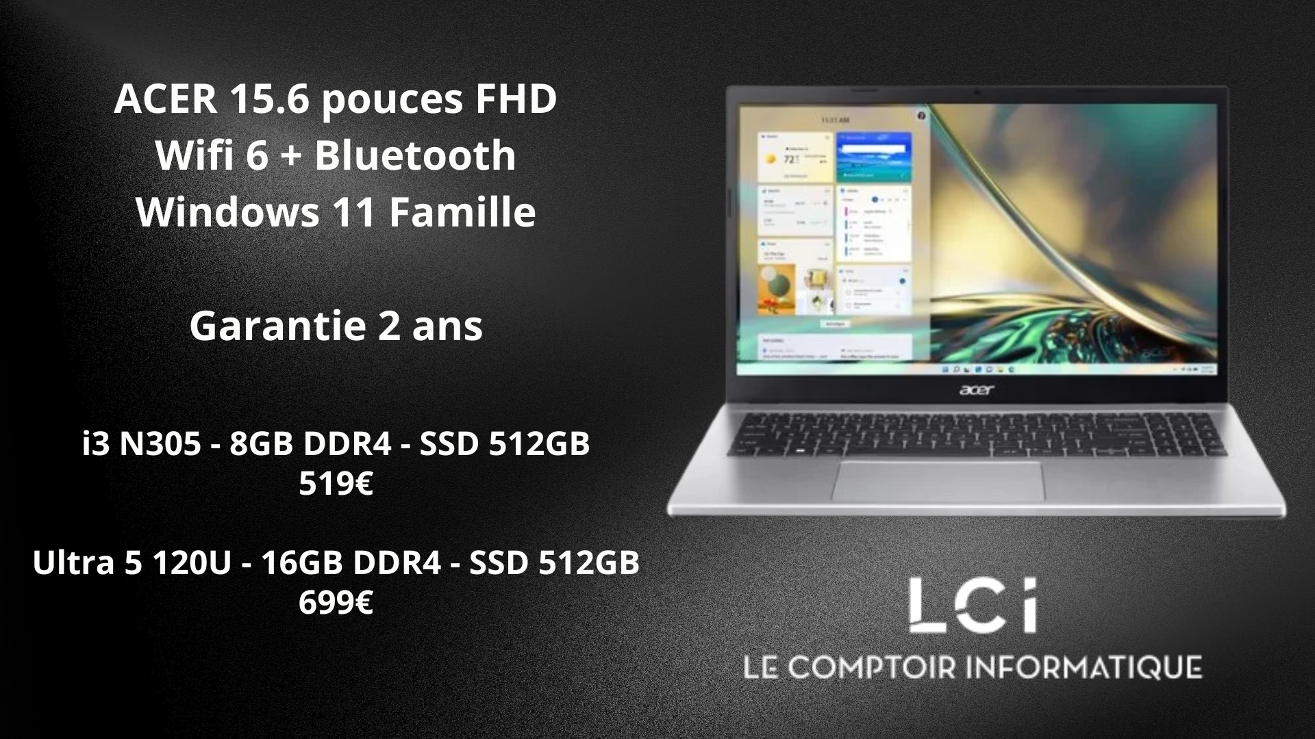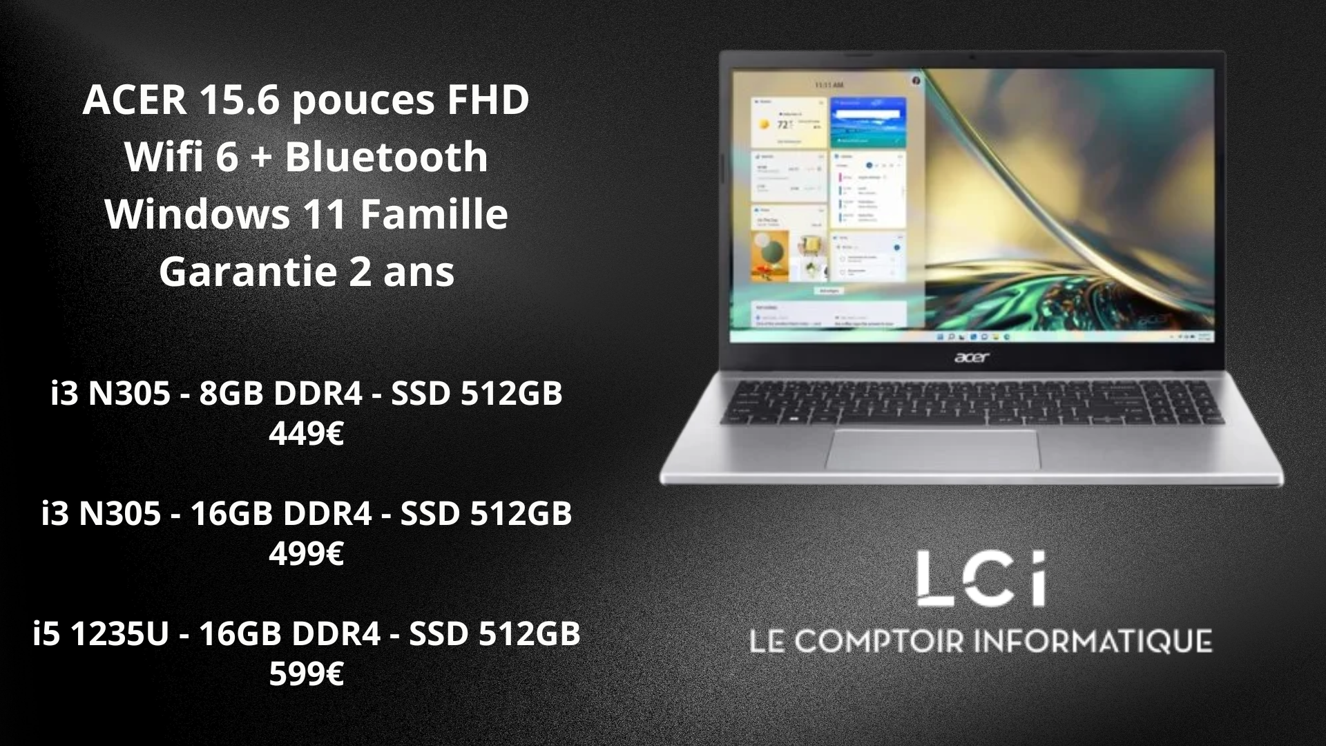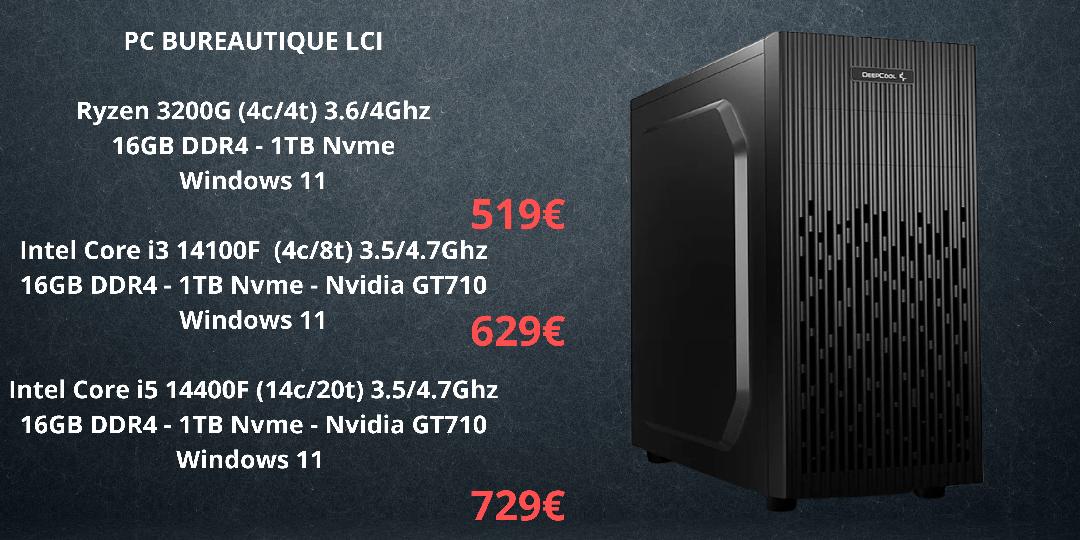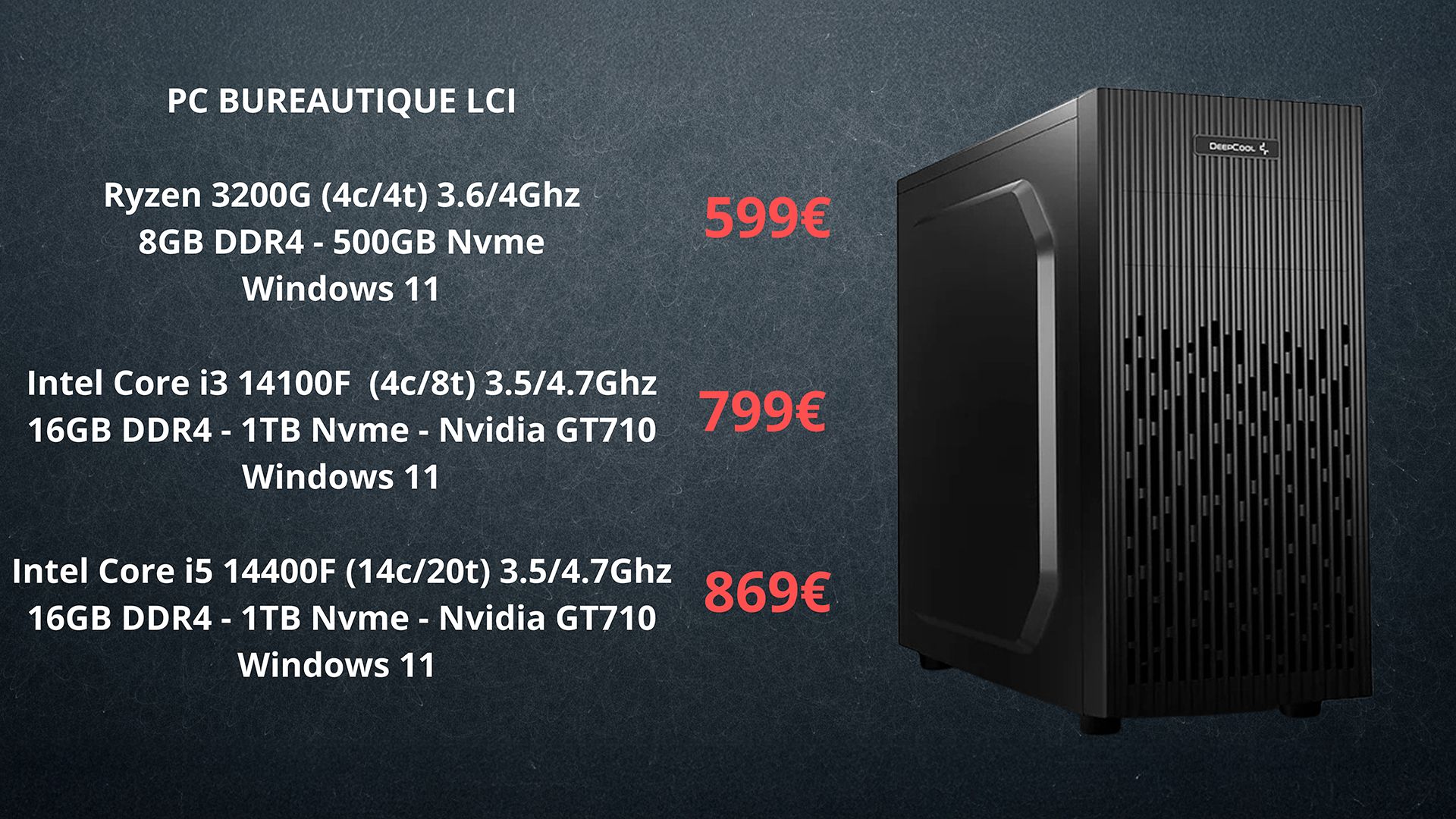 Chez LCI, nous accompagnons particuliers et professionnels dans l’achat et la réparation d’ordinateurs, le dépannage informatique et l’assemblage de PC sur mesure. Nous proposons un large choix d’ordinateurs de bureau, portables, composants et périphériques, sélectionnés pour leur compatibilité, leurs performances et leur durabilité.
